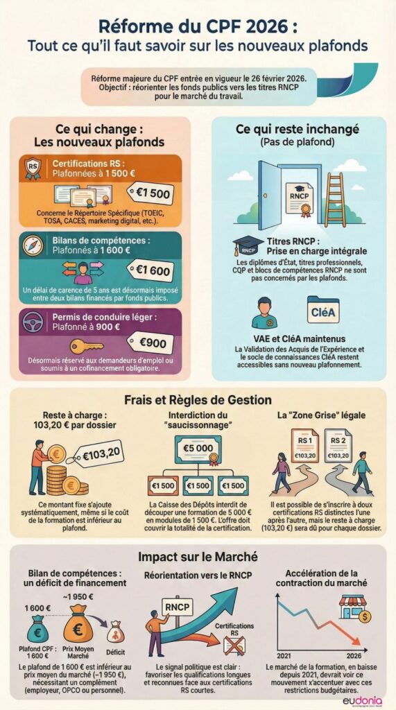 Pour les professionnels de l’accompagnement (psychologues, coachs, consultants RH) : si vos clients utilisent le CPF pour financer un bilan de compétences, sachez que le plafond de 1 600 € est en dessous du prix moyen du marché (environ 1 950 €). Le complément devra venir d’ailleurs : abondement employeur, OPCO, ou reste à charge personnel.