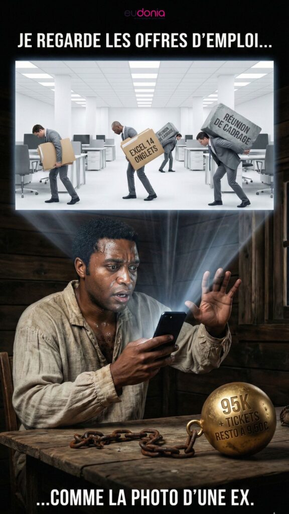 Les annonces défilent. Les salaires entre 75 et 95K. Les tickets resto à 9,50€. Le télétravail deux jours par semaine. La mutuelle famille.