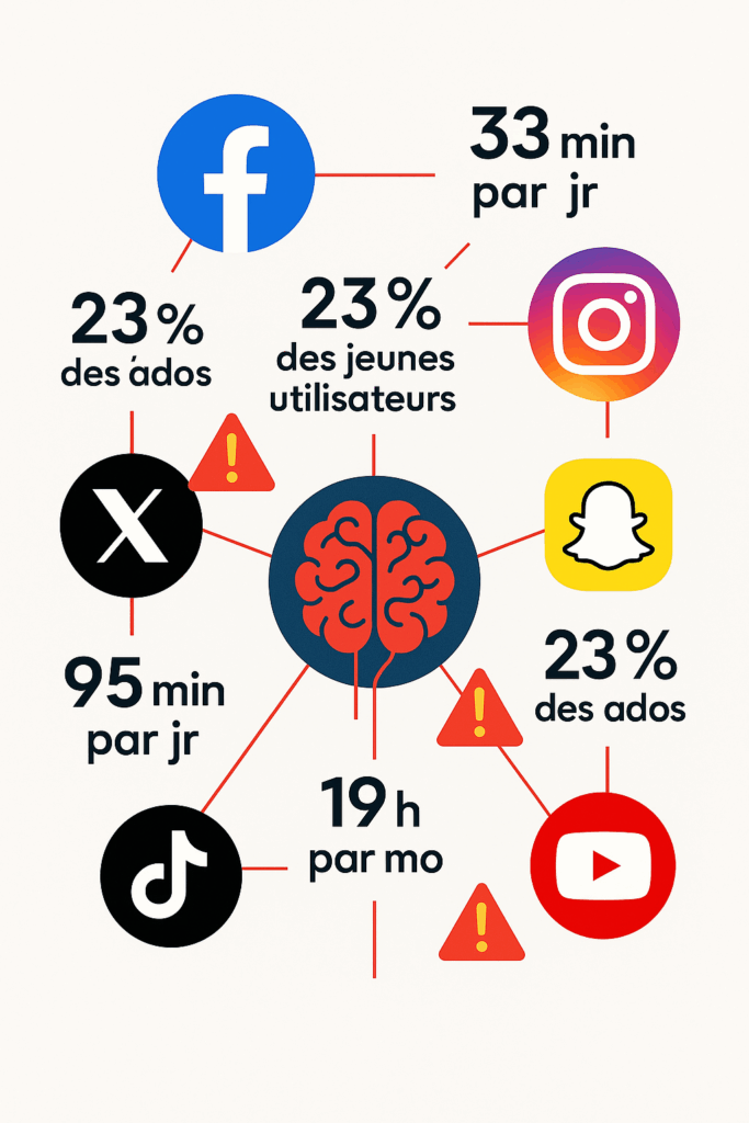 Facebook, avec ses 3 milliards d’utilisateurs, a transformé les relations sociales en métriques de popularité. Instagram cultive l’anxiété par la comparaison sociale permanente. Snapchat cible les plus jeunes avec des mécaniques addictives sophistiquées.