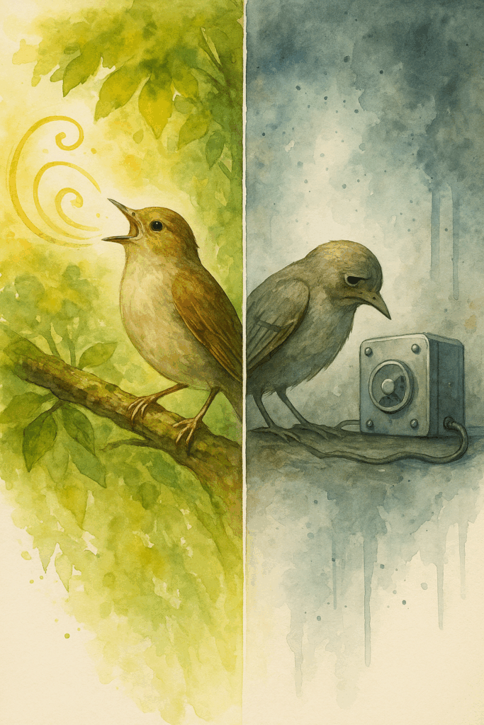 Un jour, un inventeur proposa au rossignol un appareil merveilleux. Cette machine pouvait analyser ses compositions et générer automatiquement de nouveaux chants encore plus élaborés. « Tu seras libéré de l’effort créatif », promettait l’inventeur. « Plus besoin de chercher, d’expérimenter, de te tromper. La machine fera tout cela pour toi. »