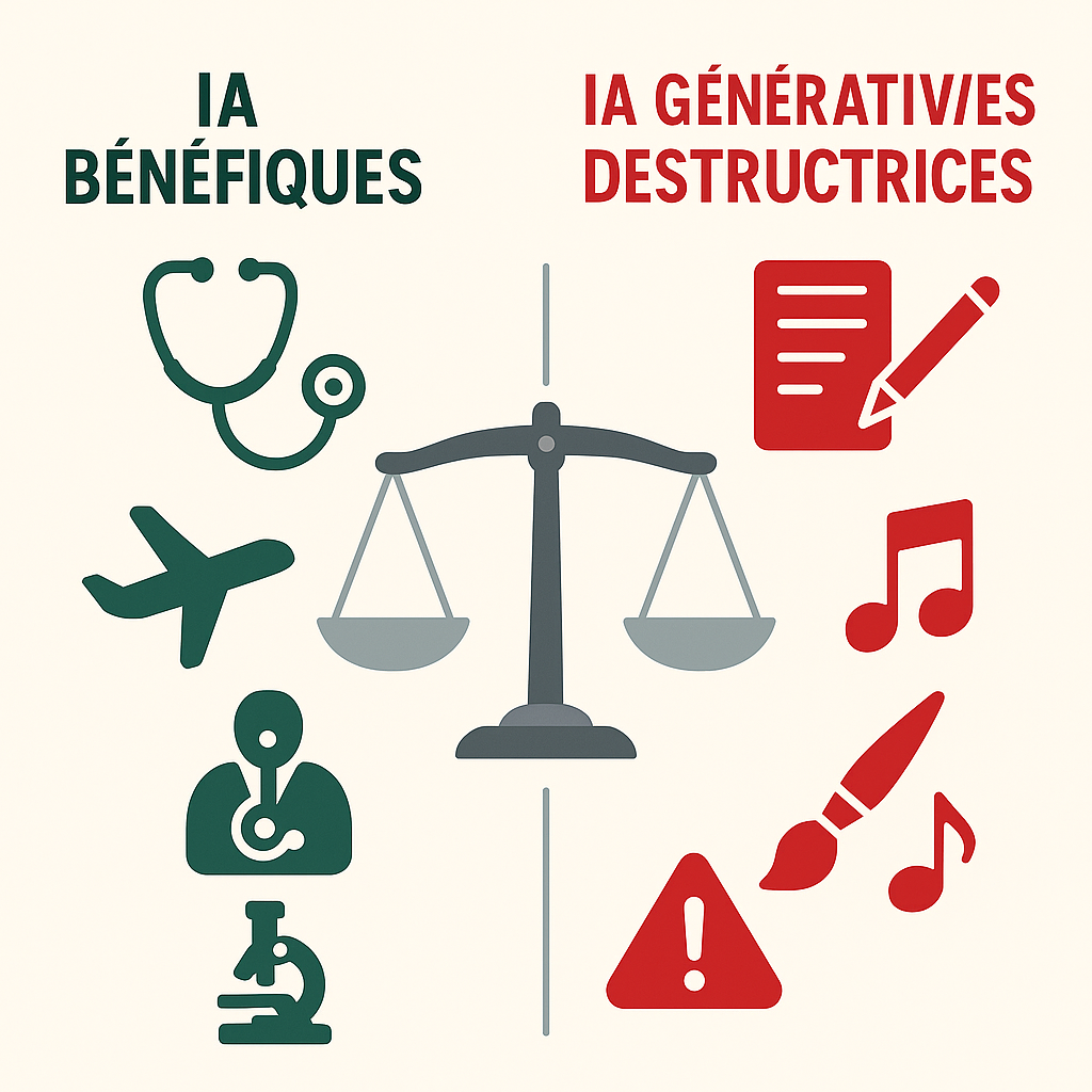 Une IA utile assiste l’humain dans l’accomplissement d’une tâche complexe sans la réaliser entièrement à sa place, comme l’IA médicale qui aide au diagnostic ou l’IA aéronautique qui optimise la sécurité. Une IA générative, en revanche, se substitue complètement à l’activité intellectuelle ou créative humaine en produisant des contenus originaux (textes, images, musiques) qui auraient normalement requis l’intervention directe d’un créateur humain. La première augmente nos capacités, la seconde les remplace et risque de les atrophier.