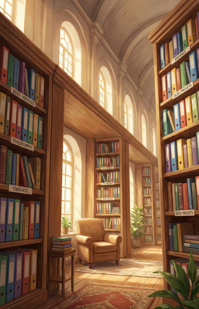 Lorsqu’elle cherche un souvenir spécifique, Lucie se promène mentalement dans cette pièce et ouvre le bon classeur. Un peu comme vous chercheriez votre CV dans une pochette jaune où vous rangez tous vos documents professionnels. Simple. Efficace. Organisé.
