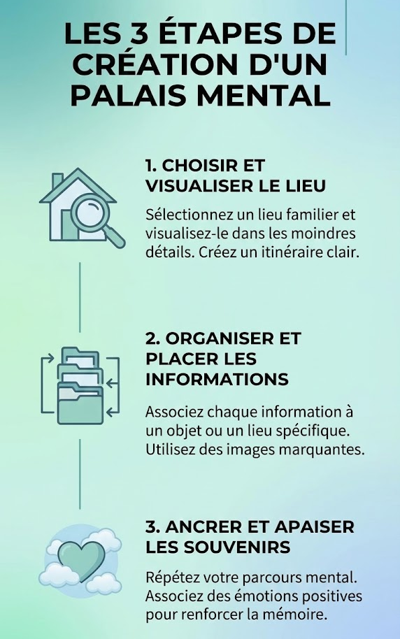 Commencez simple. Choisissez un lieu familier. Visualisez-le clairement. Placez-y quelques informations importantes. Entraînez-vous régulièrement. Observez les résultats.