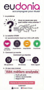 STORY est un questionnaire d’orientation professionnelle différent. Au lieu de vous demander « quel métier vous attire », il analyse ce qui vous rend unique : vos soft skills. Ces compétences comportementales — votre façon de travailler, de communiquer, de vous adapter — sont les vrais prédicteurs de votre épanouissement professionnel.